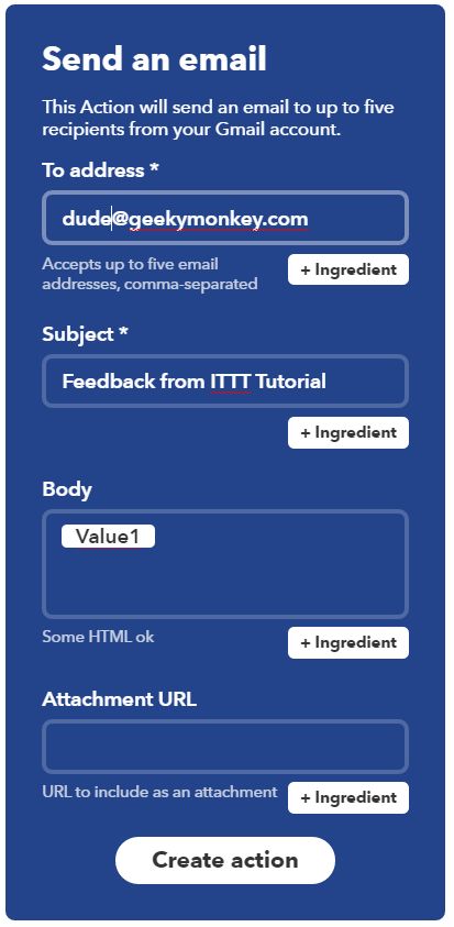 In this tutorial we will configure IFTTT to send an email using a Gmail account whenever a special URL is hit.
